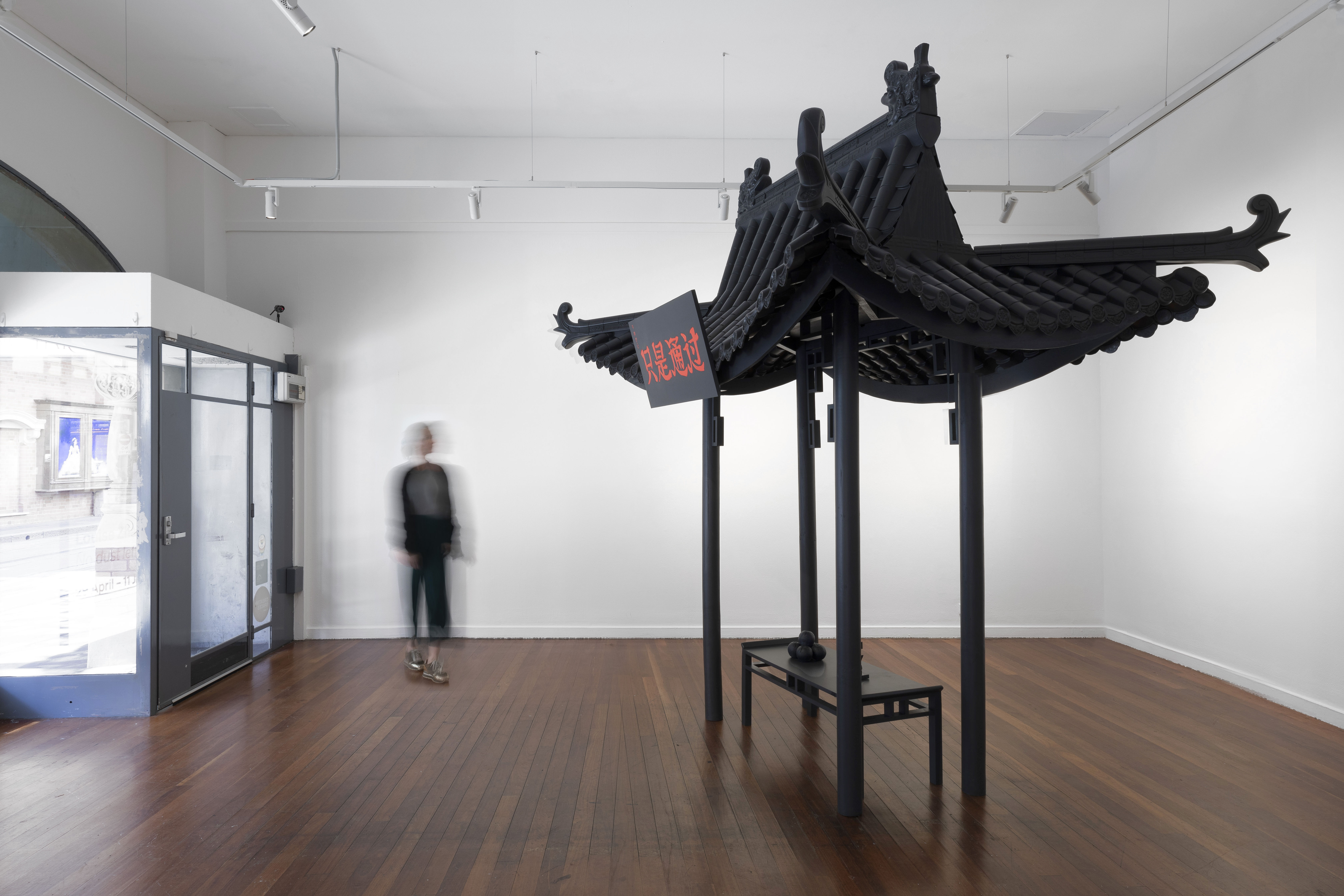 Zhang’s work Temple combined elements borrowed from a paifang with adornments emulating those from her family temple on Qidu. With assistance from family photographs, the temple was largely reconstructed from memory and serves to document this collaboration between generations. However, the opportunity to walk under the archway is prevented by what appears to be a small table with offerings. On closer inspection, one of the votives takes the form of a crucifix making reference to Christianity and to Zhang’s parents who forbad her entry, as practicing Christians, to the ancestral shrine. The symbolism of the portal is thereby denied and, as curator of the show Con Gerakaris writes: ‘Through its recreation in the gallery, [Zhang] attempts to rebuild what has been lost – a missing link between Zhang and her ancestors’.